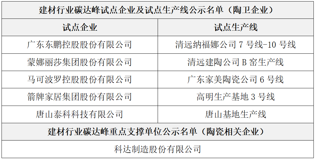 此外,11月20日,中国建筑材料联合会对拟确定的“建材行业碳达峰试点企业”、“建材行业碳达峰重点支撑单位”名单予以公示。其中,东鹏、蒙娜丽莎、马可波罗、箭牌、泰科入选建材行业碳达峰试点企业及试点生产线名单,科达入选建材行业碳达峰重点支撑单位名单。