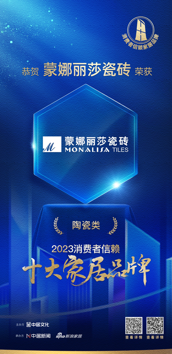 作为陶瓷类的佼佼者,蒙娜丽莎瓷砖凭借品牌综合实力,荣膺「2023消费者信赖十大家居品牌」陶瓷类十大品牌。