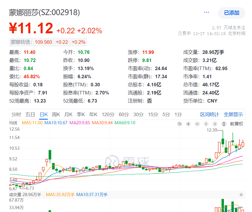 12月27日,截至14:32,蒙娜丽莎(002918.SZ)股价涨2.02%,报11.12元/股,总市值为46.17亿元。
