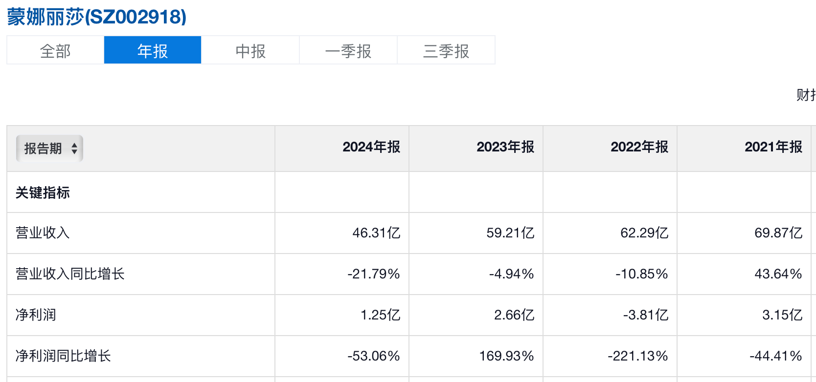 若看年报数据,近4年时间里,蒙娜丽莎在其中3年均出现净利润同比下滑。继2021年净利润同比下滑44.41%至3.15亿元、2022年同比下滑221.13%至净亏损3.81亿元之后,2024年蒙娜丽莎营收46.31亿元,同比下滑21.79%;归属净利润1.25亿元,同比下滑53.06%。