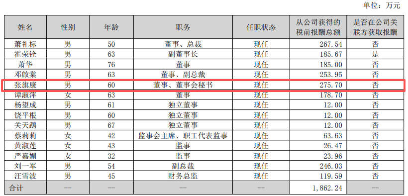 最近几年,尽管蒙娜丽莎业绩增长承压,但作为公司董秘的张旗康薪酬总额一直在上涨。2021年至2024年,其从公司获得的税前报酬总额分别为209.21万元、252.89万元、259.75万元和275.70万元。2024年,张旗康从蒙娜丽莎获得的税前报酬总额在所有高管中排名第一。