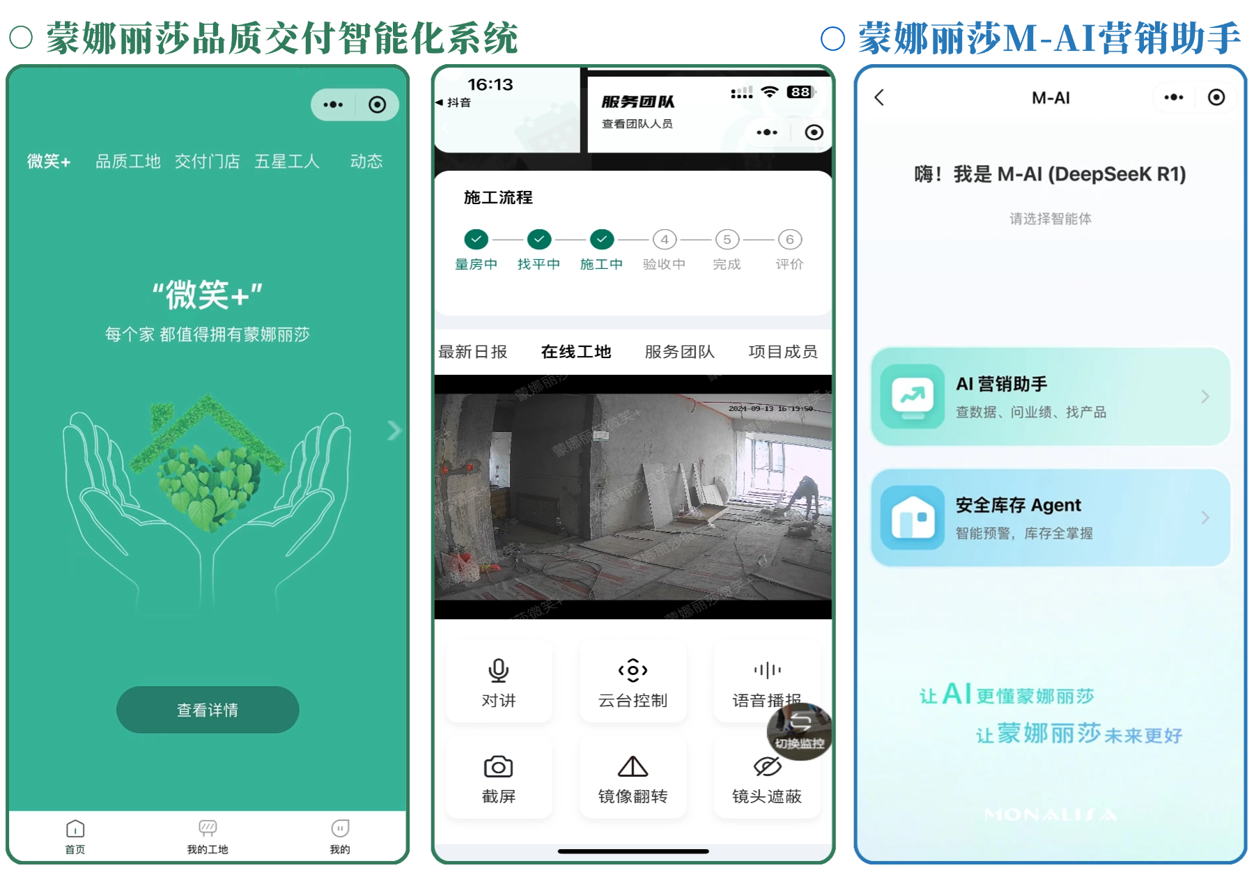 继设计家AI系统、品质交付智能化系统等智慧平台和全域数字营销矩阵开发,2025年, 蒙娜丽莎 在营销系统接入AI算法模型,正式上线M-AI系统,为用户打造咨询、产品查询等功能的信息互动平台。