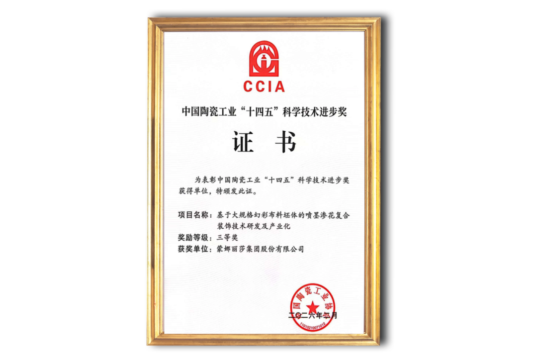 ■ “基于大规格幻彩布料坯体的喷墨渗花复合装饰技术研发及产业化”项目获中国陶瓷工业“十四五”科学技术进步奖三等奖