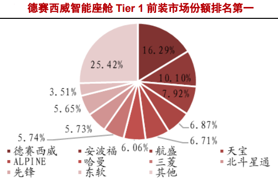2020年,德赛西威在智能座舱领域前装市场份额排名第一(16.29%)、英国的安波福(10.1%)、航盛(7.92%)。在智能车机市场前三名分别为德赛西威(11.4%)、安波福(11%)、航盛(7.5%)。