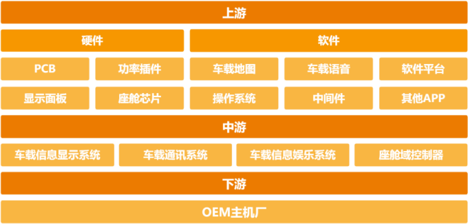 智能座舱产业链上游可分为芯片等硬件供应商以及操作系统、中间件、应用程序等软件供应商;产业链中游包括车载信息显示系统、车载通讯系统、车载信息娱乐系统、座舱域控制器等软硬件集成供应商;产业链下游包括主机厂。