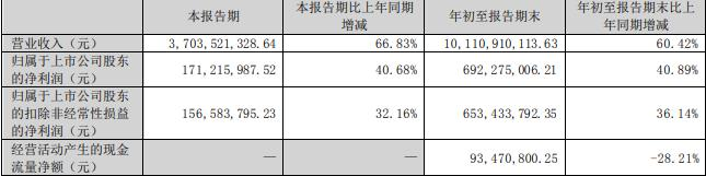 前三季度,公司实现营业收入101.11亿元,同比增长60.42%;归属于上市公司股东的净利润6.92亿元,同比增长40.89%;归属于上市公司股东的扣除非经常性损益的净利润6.53亿元,同比增长36.14%;经营活动产生的现金流量净额9347.08万元,同比减少28.21%。