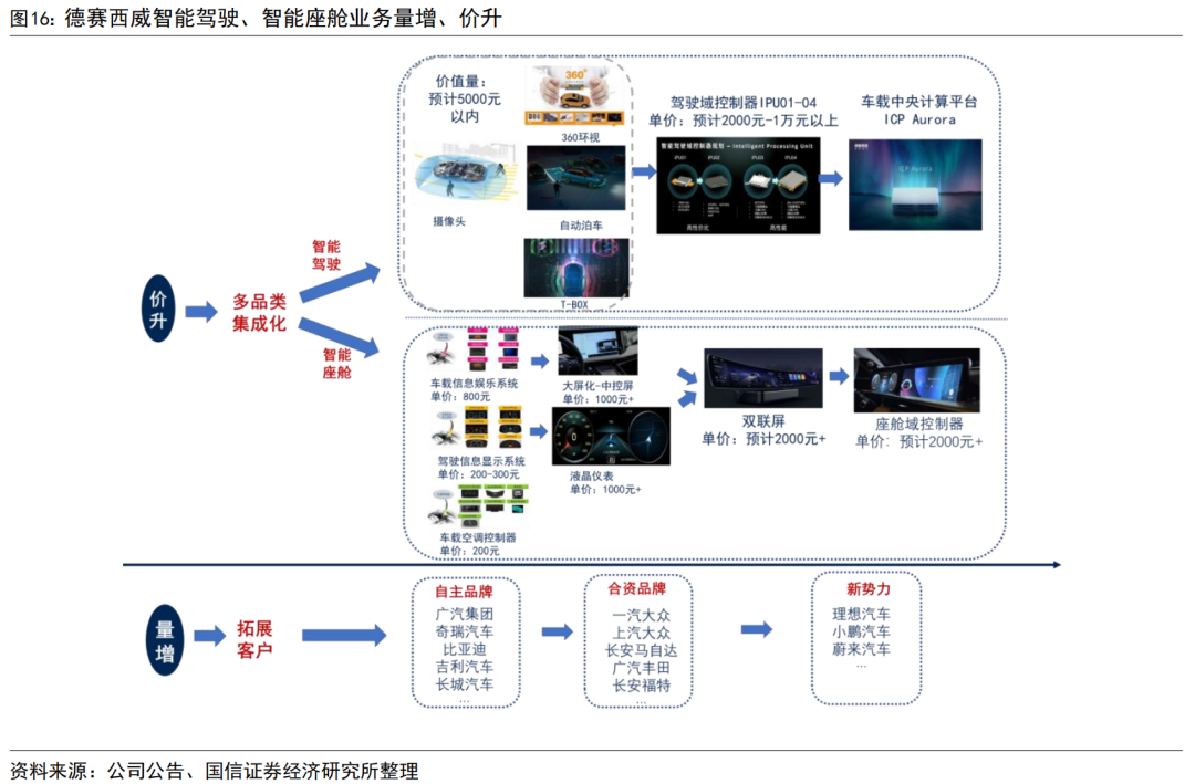 复盘德赛西威发展路径,从智能座舱到智能驾驶,从大单品到集成化,从自主-合资-头部自主、新势力和合资,量增(拓客户)、价升(高附加值产品品类延展)是贯穿德赛西威客户和产品的核心逻辑。