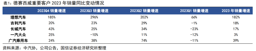 一方面,存量端,公司重要客户理想汽车、吉利汽车、长城汽车、一汽大众、广汽乘用车在2023Q4的销量同比分别+185%、+20%、+43%、+25%、+24%;另一方面增量车型和增量产品贡献了2023Q4重要的业绩增长,增量车型或来自于理想、吉利、丰田、广汽、奇瑞等。