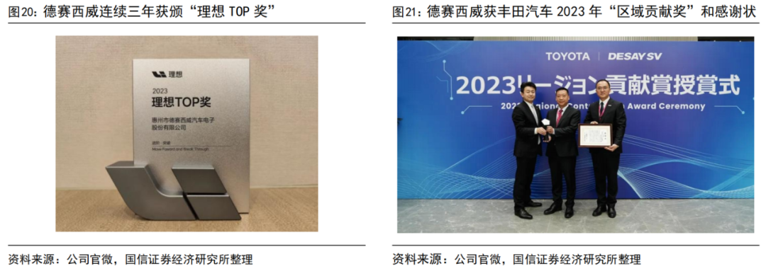 德赛西威坚持以客户为中心,打造以客户为导向的组织管理体系,带动生态开放合作,协同全球客户增长,获得广大客户的认可。在海外,公司作为全球仅有的五家获奖供应商之一,荣获“2023 年度丰田汽车区域贡献奖”。在国内,2023 年公司荣获“理想 TOP 奖”、“奇瑞汽车卓越开发创领奖”、“广汽埃安十佳合作伙伴奖”、“广汽传祺十佳供应商”、“一汽-大众卓越合作伙伴”、“长城汽车真心伙伴奖”、“吉利汽车最佳价值贡献奖”、“上汽通用优秀供应商”、“小鹏汽车与鹏同行奖”、“比亚迪汽车 2023 最佳合作伙伴”、“长安汽车战略生态奖”、“广汽丰田原价优秀奖”、“广汽丰田品质共进奖”。2024年3月22日,丰田汽车采购管理部一行来到德赛西威惠南园区,为德赛西威颁发了2023年“区域贡献奖”和感谢状,该奖项是丰田汽车最高荣誉之一,本年度仅五家供应商获此殊荣,多项重磅荣誉是丰田汽车对德赛西威不懈投入的高度认可,也是双方合作坚如磐石的重要象征。