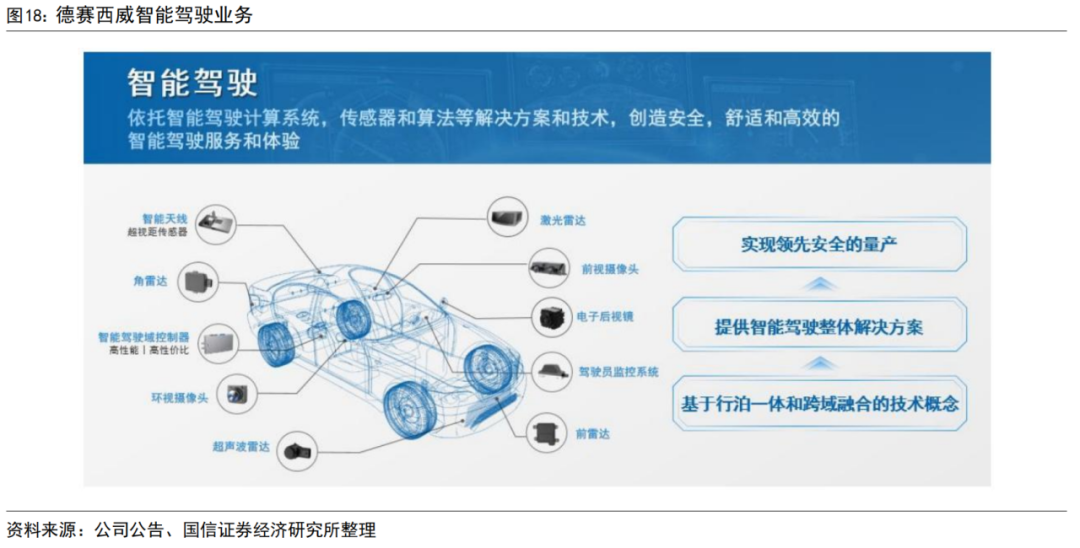 能源-运动-交互,德赛西威为集运动与交互于一体的汽车智能化龙头。展望未来汽车,大致可以分为底盘之上及底盘之下,底盘之上是智能座舱下人机交互的实现场景,细分产业链为“芯片-系统-应用-显示”,屏幕、HUD、玻璃、车灯等均有望成为核心交互产品。底盘之下主要为智能电动和智能驾驶,智能电动集成三电系统,作为整车运动的核心能源支撑;智能驾驶主要是基于“传感器-计算平台-自动驾驶算法”作用到执行层面,实现横向和纵向的运动控制。总结而言,未来智能汽车整车端核心三要素即能源、运动、交互,德赛西威为集运动与交互于一体的汽车智能化龙头。