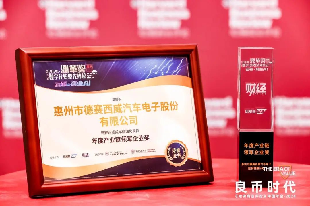 10月30日,“2024·「鼎革奖」数字化转型先锋榜”评选结果在北京正式揭晓,德赛西威荣获「年度产业链领军企业奖」。「鼎革奖」数字化转型先锋榜由《财经》杂志与 SAP 思爱普公司共同主办,《哈佛商业评论》作为核心支持媒体,多所中国双一流高校商学院及研究机构提供学术支持,是国内有影响力的数字化转型评选及交流平台。