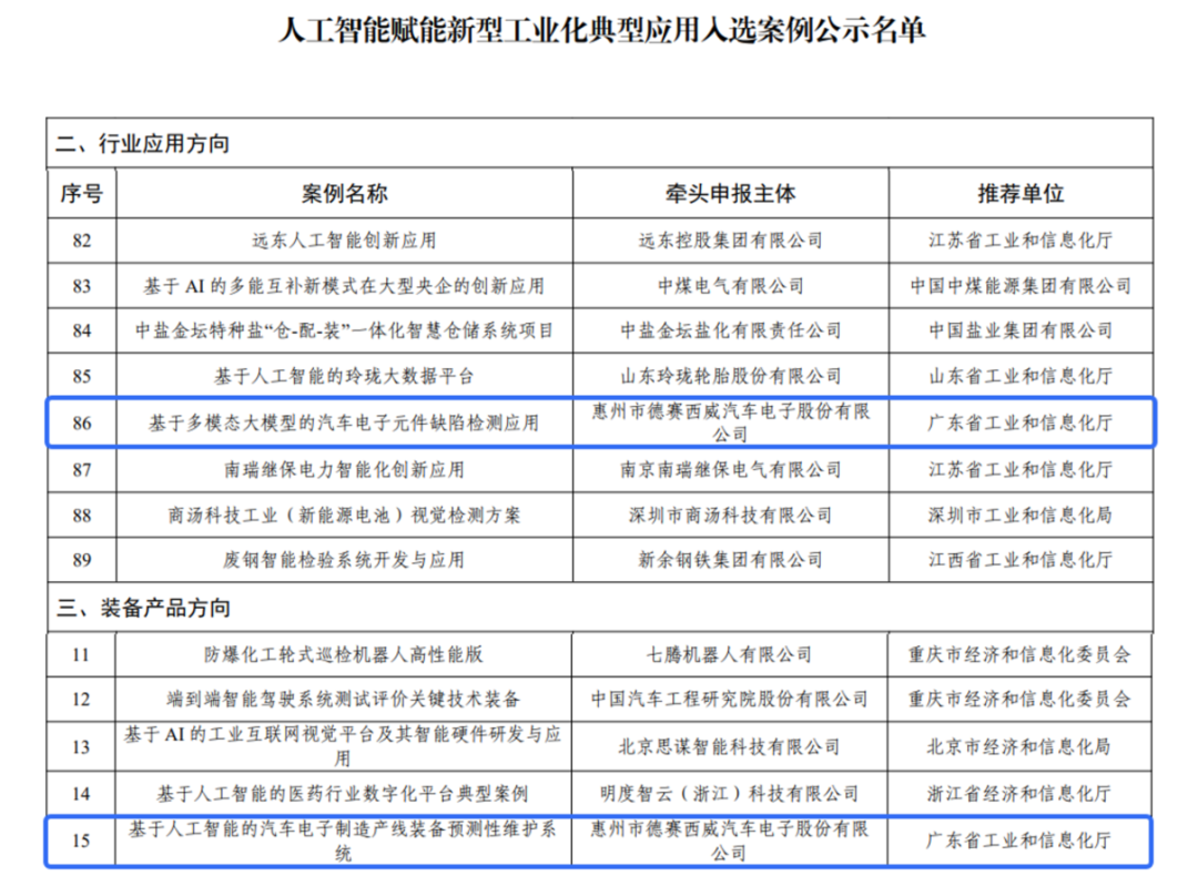 近日,工业和信息化部发布《人工智能赋能新型工业化典型应用入选案例公示》,德赛西威与威汇(全称“广东省威汇智能科技有限公司”)联合申报的“基于多模态大模型的汽车电子元件缺陷检测应用”和“基于人工智能的汽车电子制造产线装备预测性维护系统”,作为广东省惠州市仅两项申报案例成功入选。