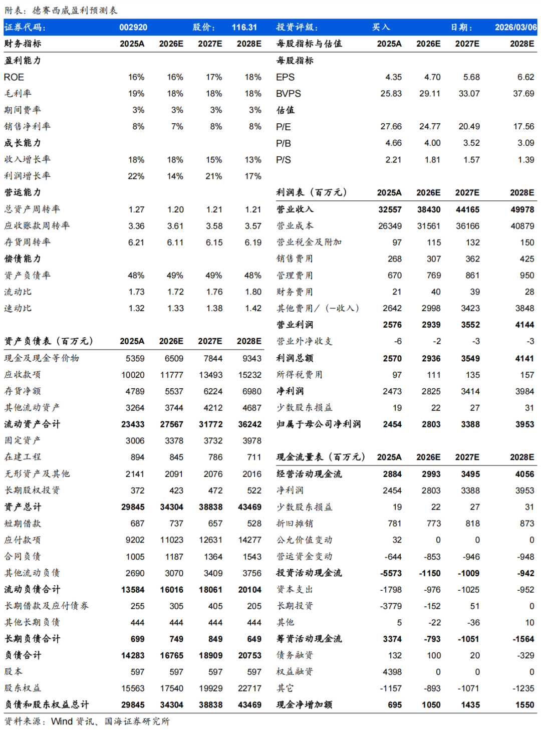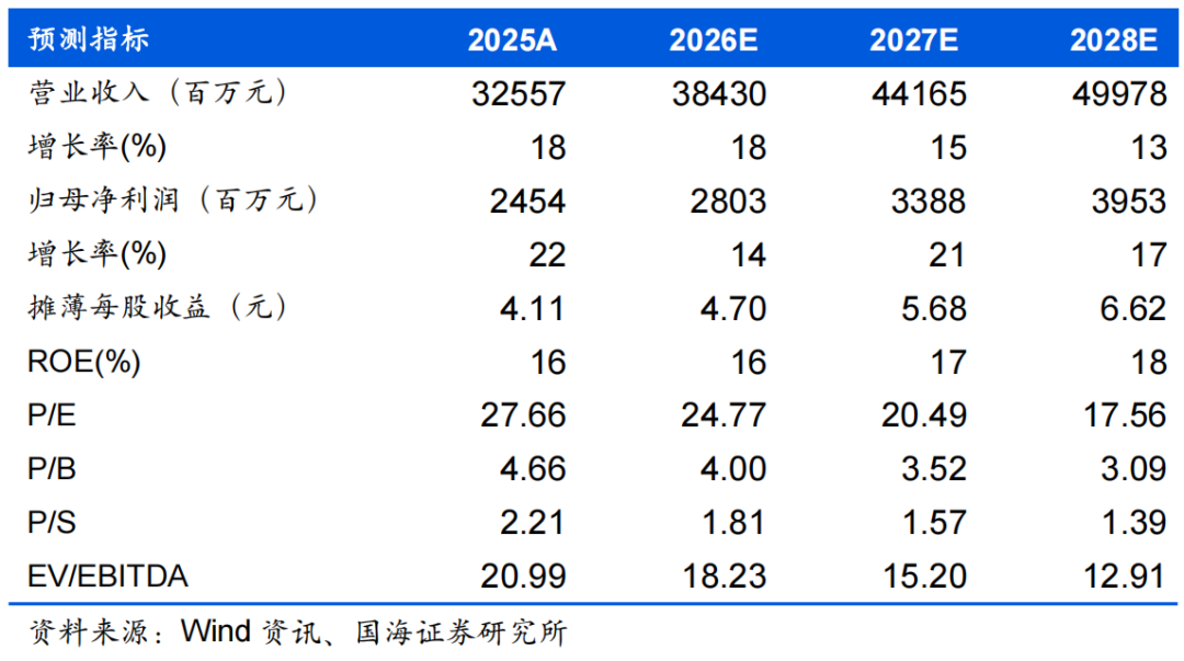 盈利预测和投资评级 我们认为作为汽车智能化核心配套企业,公司积极优化客户结构,拓展高毛利海外市场,发展无人物流和具身智能等高潜力新赛道并将迎来商业化突破,我们预计公司2026-2028年将实现营业收入384、442、500亿元,同比增速为18%、15%、13%;实现归母净利润28.03、33.88、39.53亿元,同比增速为14%、21%、17%,对应当前股价的PE估值分别为25、20、18倍。维持公司“买入”评级。