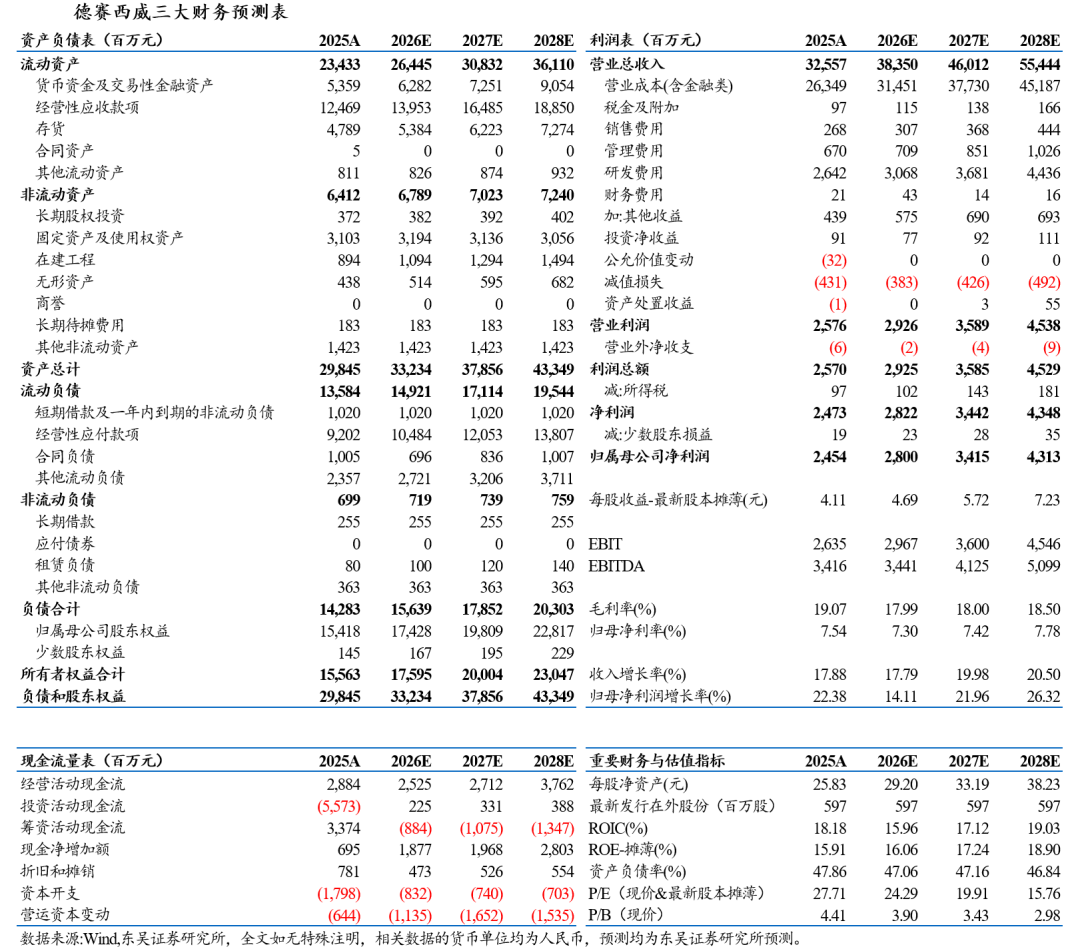 2025年公司销售/管理/研发费用率同比下降彰显规模效应,销售费用率/管理费用率/研发费用率/财务费用率分别同比-0.04pct/+0.13pct/-0.05pct/-0.51pct。2025年资产减值+信用减值4.31亿,其中Q4合计为-3.03亿元,压低表观利润。公司经营活动产生的现金流量净额为288.4亿元,同比+93.09%,增长原因系本期销售增长,客户回款增加;投资活动产生的现金流量净额为-55.73亿元,同比-278.58%,大幅降低原因系本期购买理财产品增加。