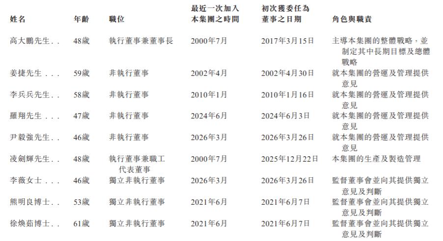 高大鹏,48岁,为执行董事兼董事长。他于2017年3月获委任为董事,并于2022年7月至2024年6月期间担任副董事长;自2024年6月起担任董事长,于2026年3月26日调任为执行董事,主要负责主导集团的整体战略,并制定其中长期目标及总体战略。