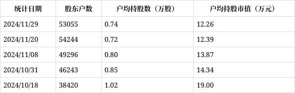 从12月4日公开信息显示,伊戈尔截至2024年11月29日公司股东户数为5.31万户,较上期(2024年11月20日)减少1189户,降幅为2.19%,变化不大。