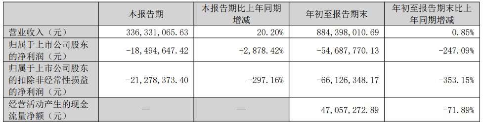 今年前三季度,公司实现营业收入8.84亿元,同比增长0.85%;归属于上市公司股东的净利润为-5468.78万元,上年同期为3718.05万元;归属于上市公司股东的扣非净利润为-6612.63万元,上年同期为2612.12万元;经营活动产生的现金流量净额为4705.73万元,同比下降71.89%。