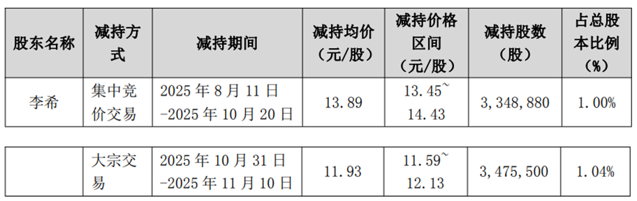 根据 润都股份 11月12日披露的《关于持股5%以上股东减持计划期限届满暨实施结果的公告》显示, 李希 于2025年8月11日至2025年11月10日通过集中竞价方式减持其持有的公司无限售条件流通股3,348,880股,通过大宗交易方式减持其持有的公司无限售条件流通股3,475,500股,合计6,824,380股,本次减持计划期限已届满。