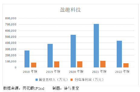 2022年盈趣实现营收43.45亿,同比减少38.46%;归属于上市公司股东的净利润6.93亿,同比减少36.57%。