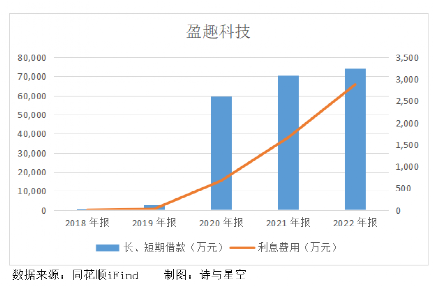 近3年盈趣科技的长、短期借款飞速增长,截止2022年末,长、短期借款余额为7.45亿,利息费用接近3000万。到了今年一季度末,借款余额进一步增至9.62亿。