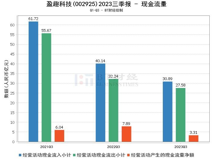 在现金流量方面,盈趣科技的经营活动产生的现金流量净额由上年同期的7.89亿元降至本报告期末的3.31亿元,经营活动现金流入小计由上年同期的40.14亿元降至本报告期末的30.89亿元,经营活动现金流出小计由上年同期的32.24亿元降至本报告期末的27.58亿元。