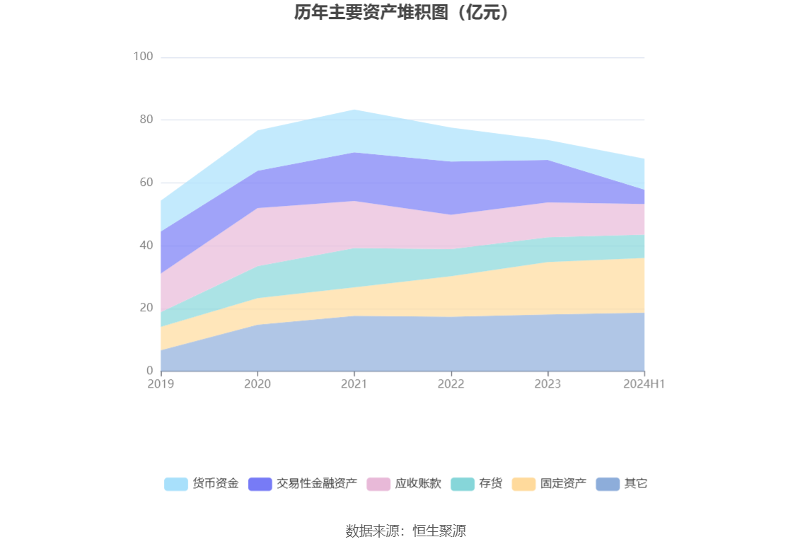 资产重大变化方面,截至2024年上半年末,公司交易性金融资产较上年末减少66.19%,占公司总资产比重下降11.59个百分点;货币资金较上年末增加55.54%,占公司总资产比重上升5.96个百分点;固定资产较上年末增加4.30%,占公司总资产比重上升3.04个百分点;应收账款较上年末减少12.30%,占公司总资产比重下降0.70个百分点。