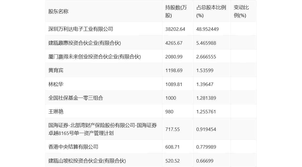 半年报显示,2024年上半年末公司十大流通股东中,新进股东为香港中央结算有限公司、建瓯山坡松投资合伙企业(有限合伙),取代了一季度末的东方红睿玺三年定期开放灵活配置混合型证券投资基金、嘉实领先优势混合型证券投资基金。在具体持股比例上,黄育宾、林松华持股有所上升,全国社保基金一零三组合持股有所下降。