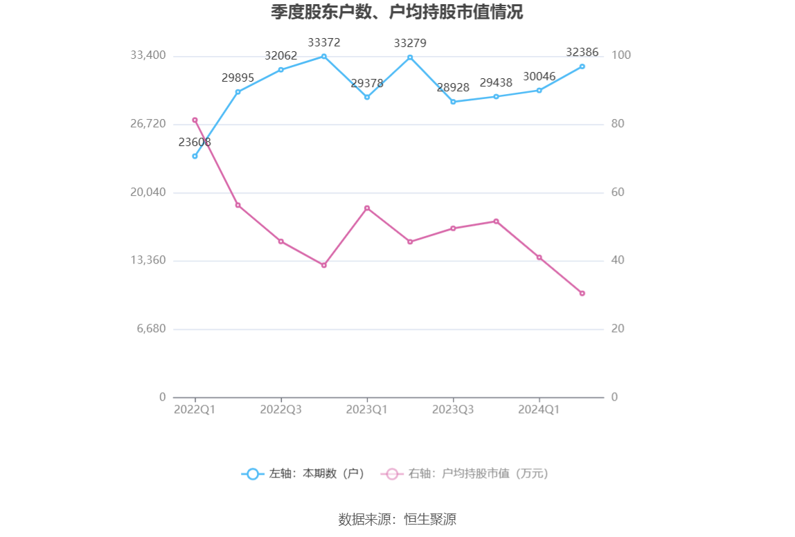筹码集中度方面,截至2024年上半年末,公司股东总户数为3.24万户,较一季度末增长了2340户,增幅7.79%;户均持股市值由一季度末的41.06万元下降至30.53万元,降幅为25.65%。