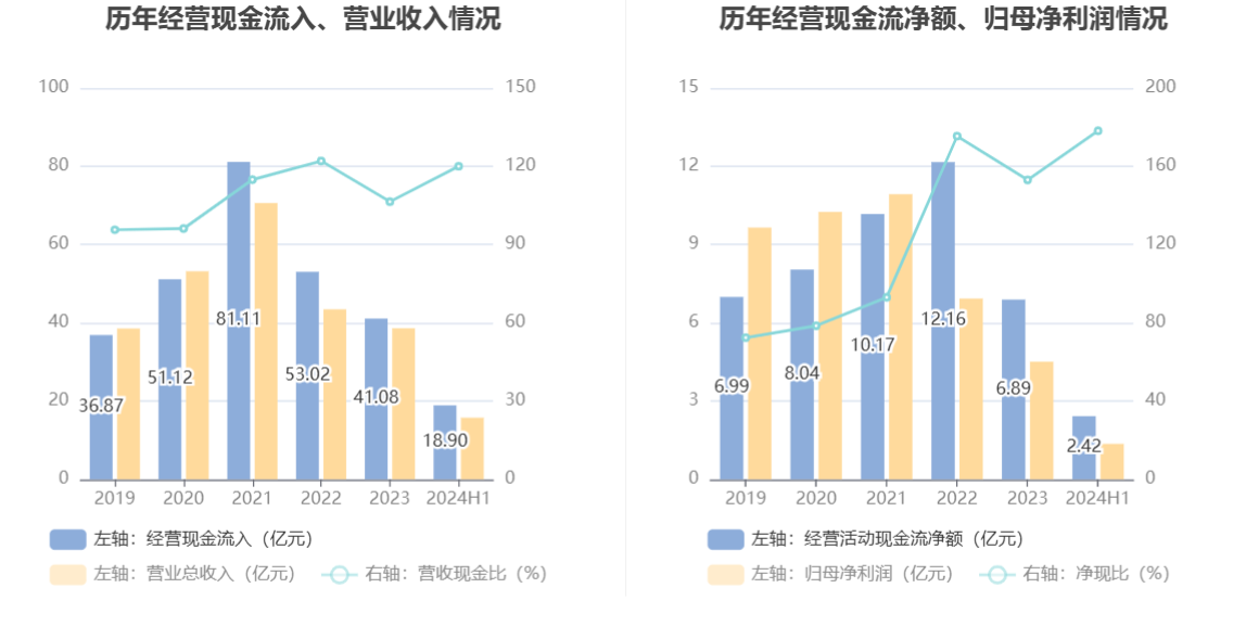 2024年上半年,公司营业收入现金比为119.99%,净现比为178.12%。