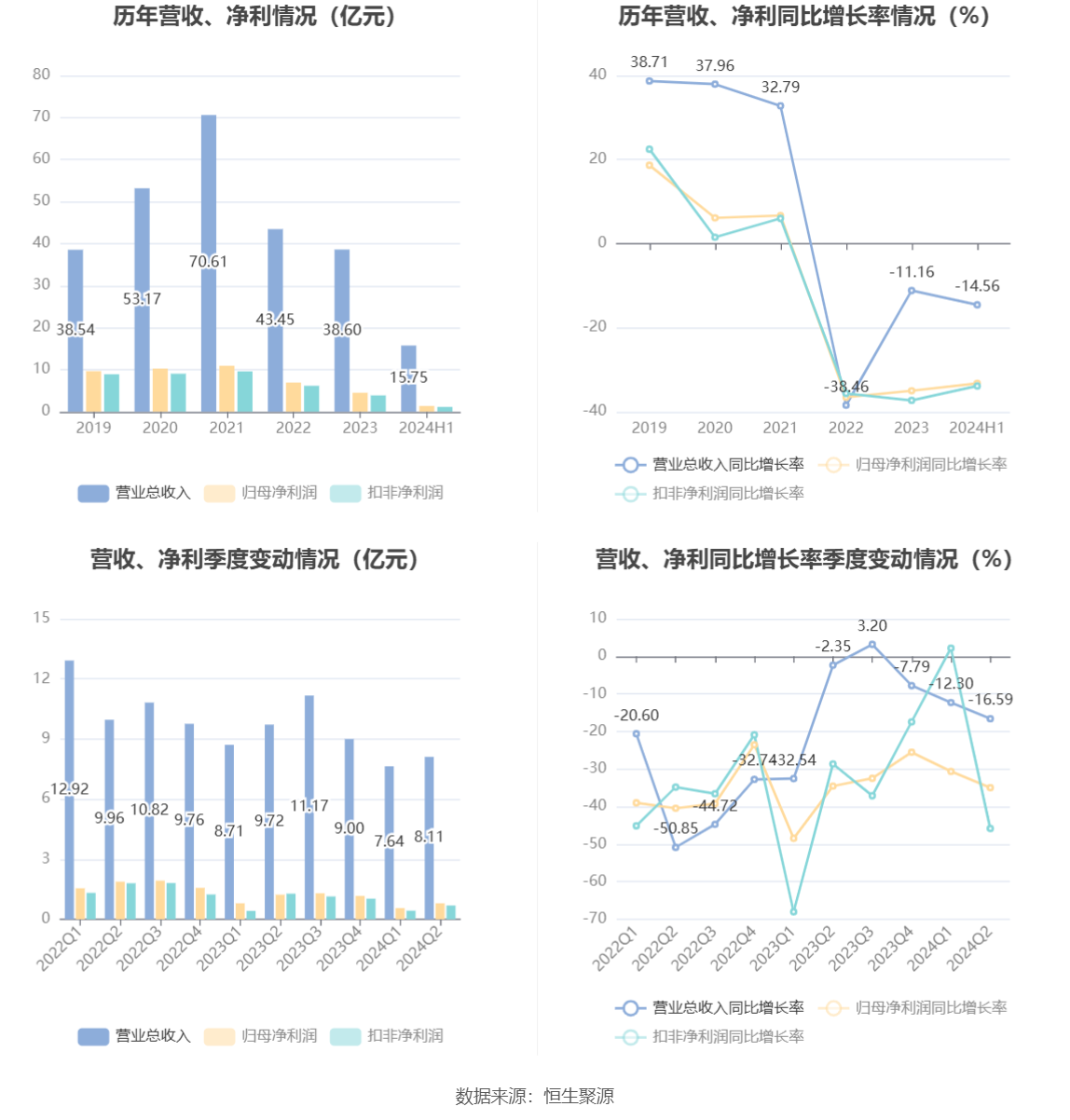 根据半年报,公司第二季度实现营业总收入8.11亿元,同比下降16.59%,环比增长6.12%;归母净利润8007.22万元,同比下降34.96%,环比增长43.98%;扣非净利润6945.86万元,同比下降45.82%,环比增长60.27%。