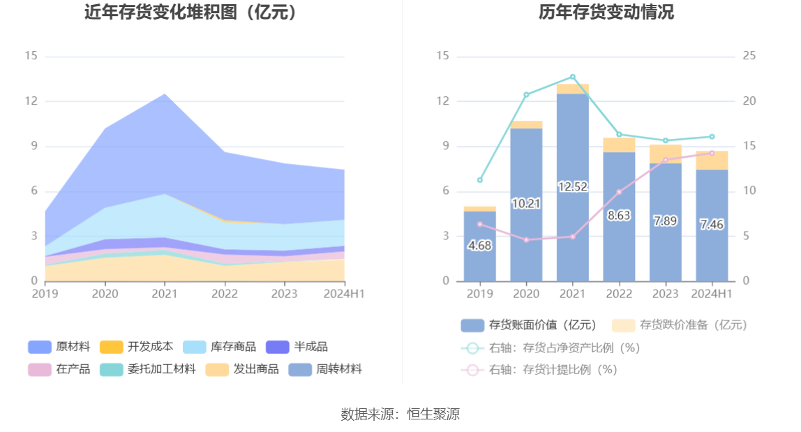 从存货变动来看,截至2024年上半年末,公司存货账面价值为7.46亿元,占净资产的16.1%,较上年末减少4291.34万元。其中,存货跌价准备为1.24亿元,计提比例为14.26%。