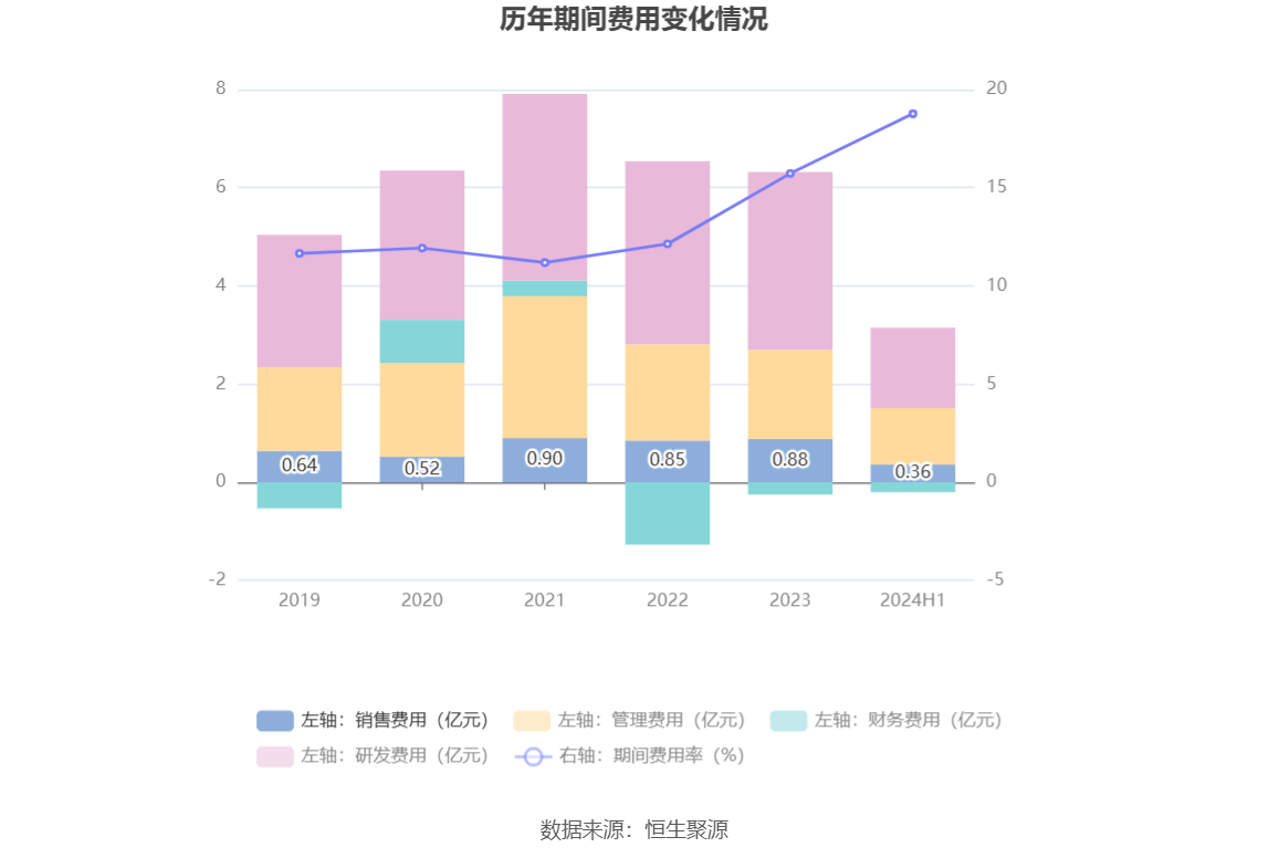 2024年上半年,公司期间费用为2.96亿元,较上年同期减少1297.43万元;但期间费用率为18.77%,较上年同期上升2.03个百分点。其中,销售费用同比下降5.11%,管理费用同比下降10.76%,研发费用同比下降6.19%,财务费用由去年同期的-3372.13万元变为-2001.53万元。