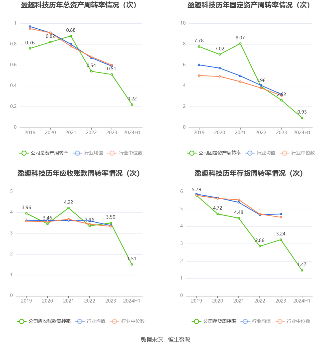 营运能力方面,2024年上半年,公司公司总资产周转率为0.22次,上年同期为0.24次(2023年上半年行业平均值为0.28次,公司位居同行业55/86);固定资产周转率为0.93次,上年同期为1.38次(2023年上半年行业平均值为1.52次,公司位居同行业47/86);公司应收账款周转率、存货周转率分别为1.51次、1.47次。