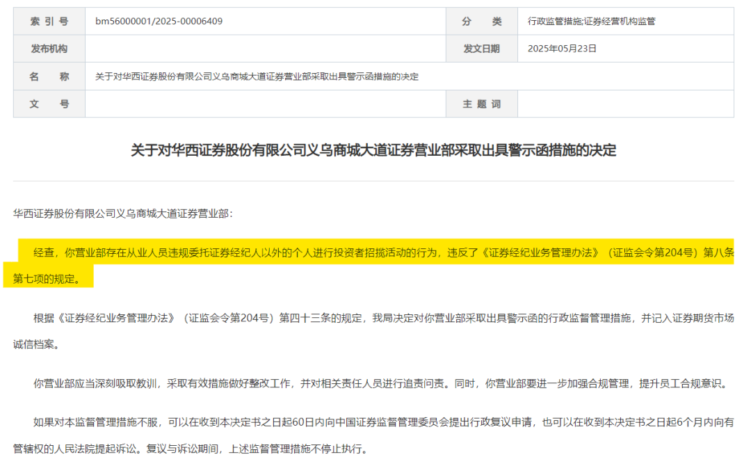 公告显示,经查,华西证券股份有限公司义乌商城大道证券营业部存在从业人员违规委托证券经纪人以外的个人进行投资者招揽活动的行为,违反了《证券经纪业务管理办法》(证监会令第204号)第八条第七项的规定。