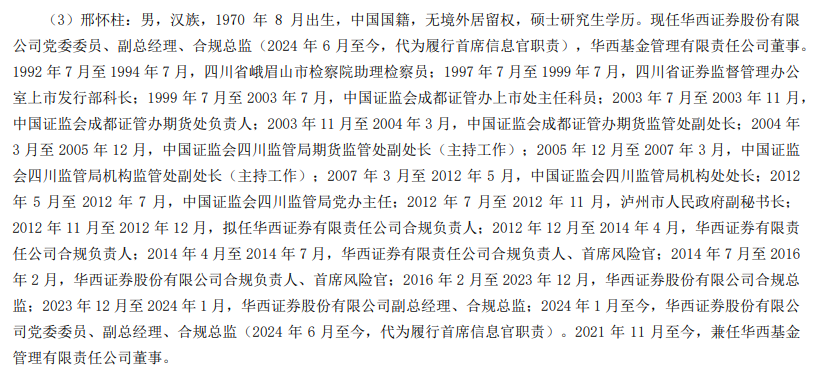 作为华西证券分管合规高管,生于1970年的邢怀柱先生,当得起老将称谓:早年他曾在司法机关和证监系统任职,并且曾经挂职泸州市政府副秘书长。2012年,他加入华西证券,长期负责合规管理。