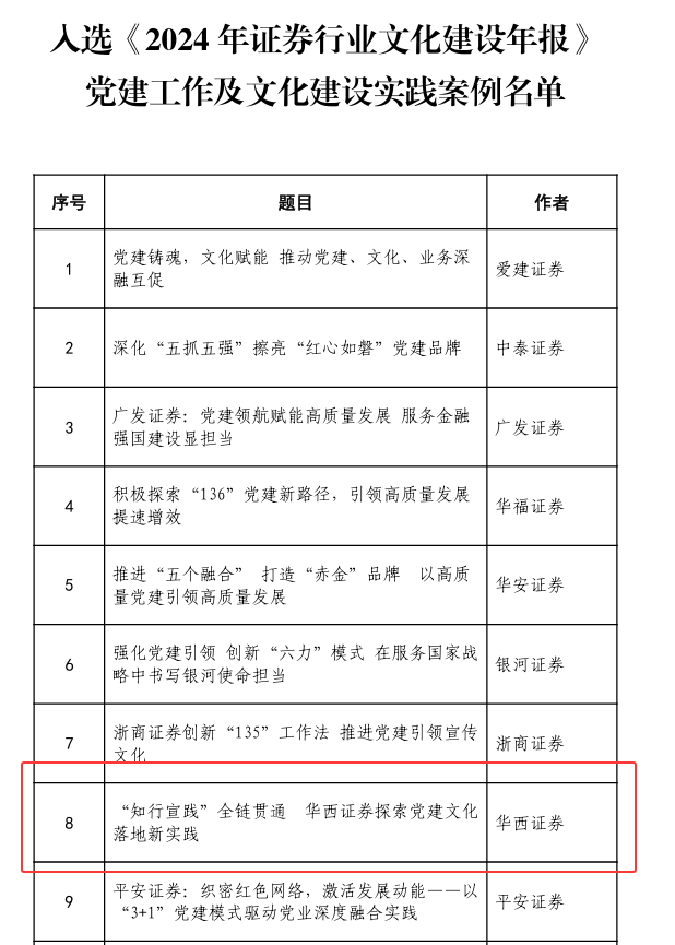 8月21日,中国证券业协会在其官方网站发布入选《2024年证券公司文化建设年报》实践案例名单的公告,华西证券党建工作特色案例《“知行宣践”全链贯通华西证券探索党建文化落地新实践》入选,这是自2021年中国证券业协会开始评选文化建设实践案例以来,公司党建工作案例第三次入选《证券公司文化建设年报》,充分体现了公司在党建与企业文化深度融合方面的持续探索和显著成效。
