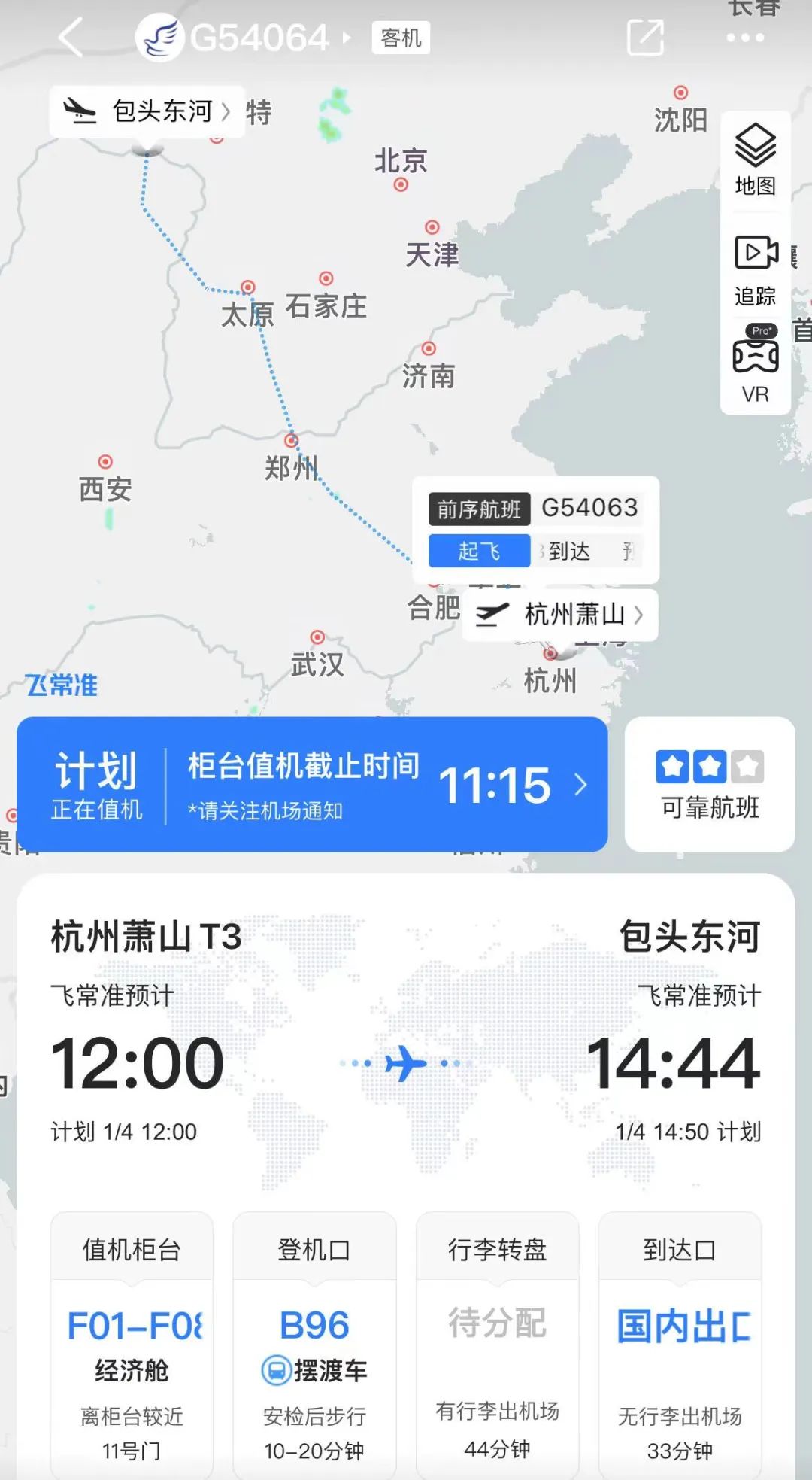 目前,记者从“飞常准“APP上看到,该航班计划在今天(1月4日)12点从杭州萧山国际机场起飞,预计到达包头东河时间为14点44分。