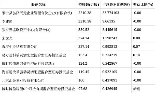 三季报显示,2022年三季度末的公司十大流通股东中,新进股东为博时博盈稳健6个月持有期混合型证券投资基金,取代了二季度末的中国人民财产保险股份有限公司-传统-普通保险产品。在具体持股比例上,宋文光、香港中央结算有限公司、易方达科瑞灵活配置混合型证券投资基金持股有所上升,睢宁县弘泽天元企业管理合伙企业(有限合伙)、李建国、张家界盛欧投资中心(有限合伙)、博时转债增强债券型证券投资基金、海富通改革驱动灵活配置混合型证券投资基金、北京汇金嘉业投资有限公司持股有所下降。