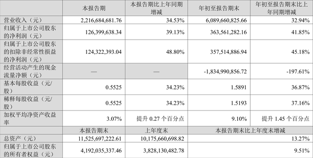 根据三季报,公司第三季度实现营业总收入22.17亿元,同比增长34.53%,环比增长2.15%;归母净利润1.26亿元,同比增长39.13%,环比下降6.09%;扣非净利润1.24亿元,同比增长48.80%,环比下降6.91%。