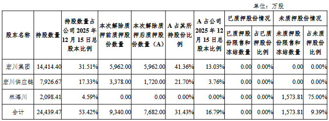 截至公告披露日,宏川供应链持有公司股份7,926.67万股,约占公司2026年1月9日总股本比例为17.33%。