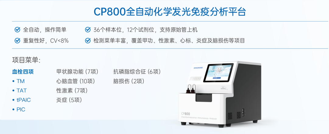 明德生物血栓四项产品可与自主研发的全自动化学发光免疫分析仪CP800配套使用,依托平台高效、精准的检测性能,实现对血栓四项的快速定量分析。