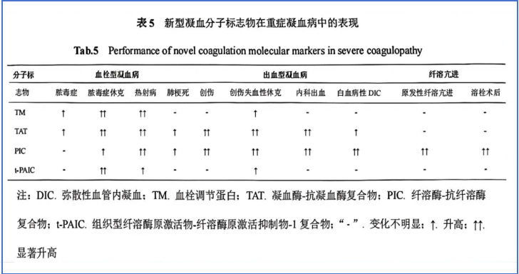 根据《重症凝血病标准化评估中国专家共识(2025版)》,推荐使用新型凝血分子标志物判断重症凝血病的分型及预后,同时,也列举出重症凝血病中血栓四项的表现情况。