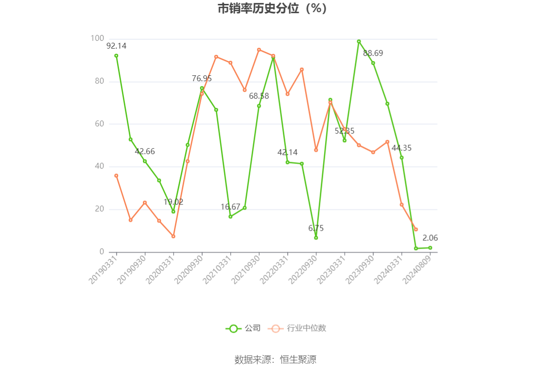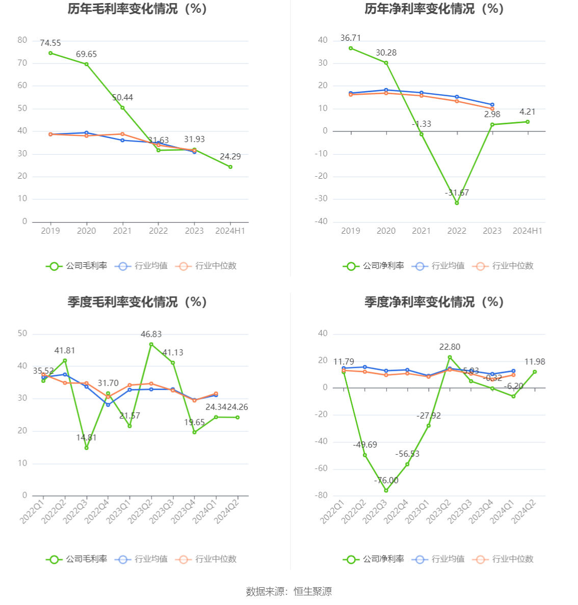 2024年上半年,公司毛利率为24.29%,同比下降13.71个百分点;净利率为4.21%,较上年同期下降0.84个百分点。从单季度指标来看,2024年第二季度公司毛利率为24.26%,同比下降22.57个百分点,环比下降0.08个百分点;净利率为11.98%,较上年同期下降10.82个百分点,较上一季度上升18.18个百分点。