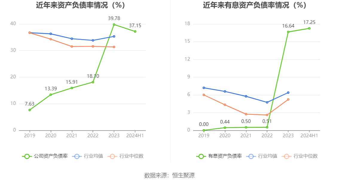 在偿债能力方面,公司2024年上半年末资产负债率为37.15%,相比上年末下降2.63个百分点;有息资产负债率为17.25%,相比上年末上升0.61个百分点。