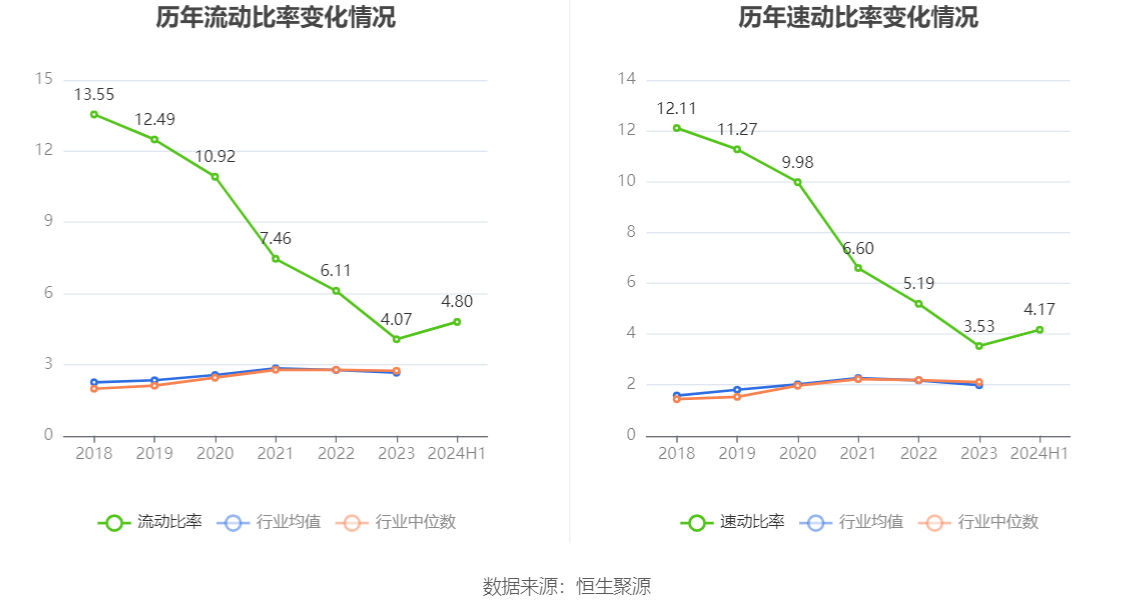 2024年上半年,公司流动比率为4.80,速动比率为4.17。