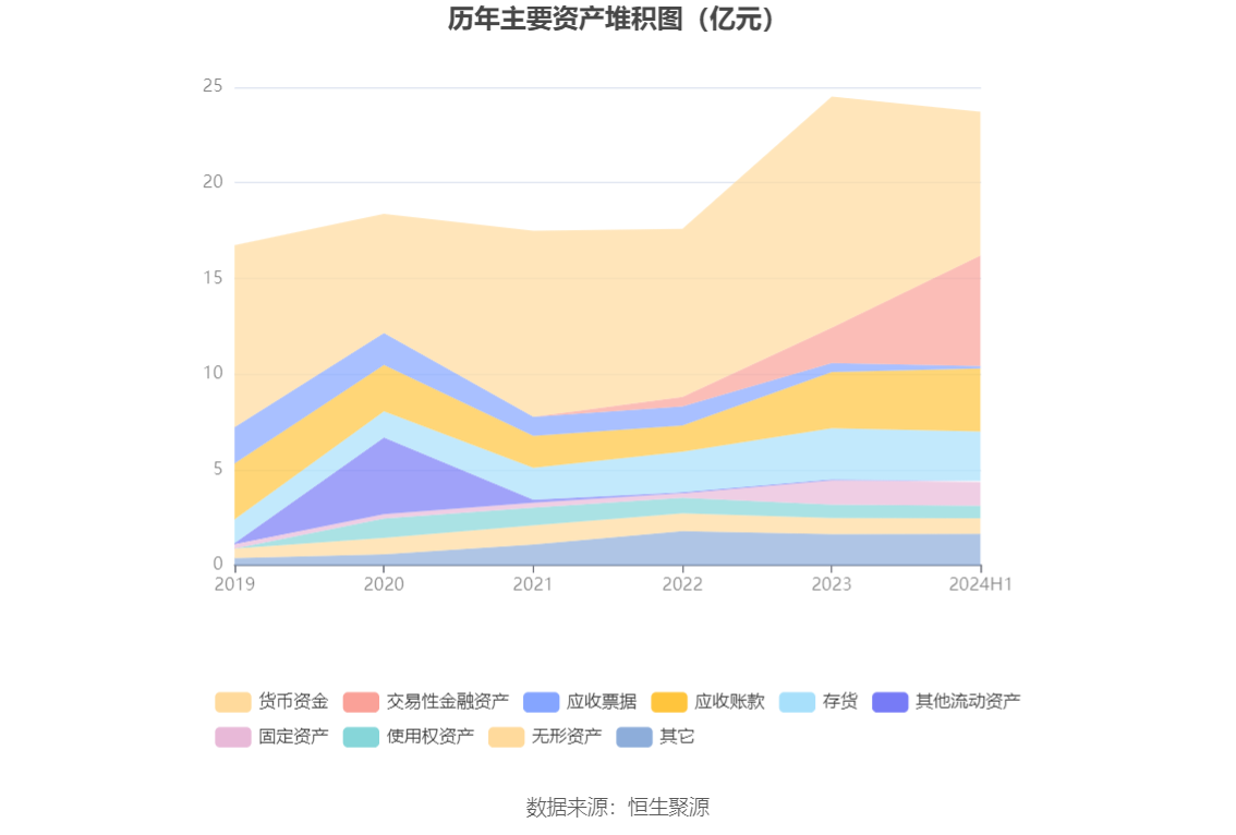资产重大变化方面,截至2024年上半年末,公司货币资金较上年末减少37.97%,占公司总资产比重下降17.65个百分点;交易性金融资产较上年末增加212.09%,占公司总资产比重上升16.85个百分点;应收账款较上年末增加12.62%,占公司总资产比重上升1.98个百分点;应收票据较上年末减少73.13%,占公司总资产比重下降1.38个百分点。