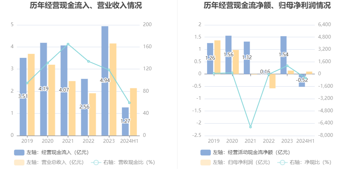2024年上半年,公司营业收入现金比为59.14%,净现比为-511.16%。