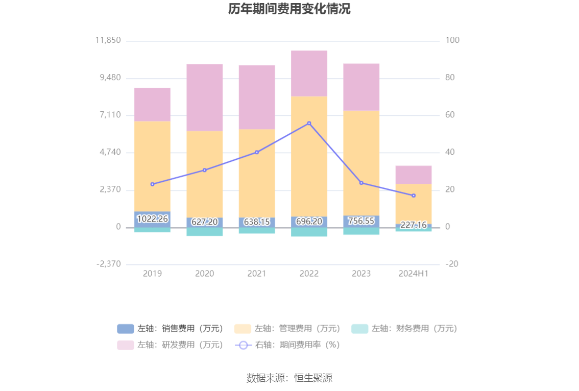 2024年上半年,公司期间费用为3668.57万元,较上年同期减少883.17万元;期间费用率为17.12%,较上年同期下降18.98个百分点。其中,销售费用同比下降22.19%,管理费用同比下降23.24%,研发费用同比下降4.07%,财务费用由去年同期的-249.51万元变为-250.99万元。