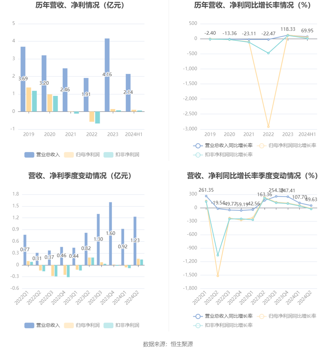 根据半年报,公司第二季度实现营业总收入1.23亿元,同比增长49.63%,环比增长33.90%;归母净利润1593.62万元,同比下降15.57%,环比增长380.85%;扣非净利润1373.59万元,同比下降27.12%,环比增长277.27%。