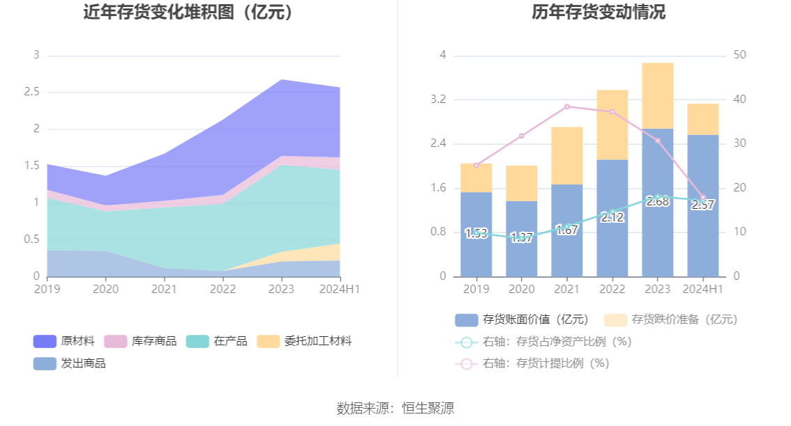 从存货变动来看,截至2024年上半年末,公司存货账面价值为2.57亿元,占净资产的17.26%,较上年末减少1113.42万元。其中,存货跌价准备为5637.79万元,计提比例为17.98%。